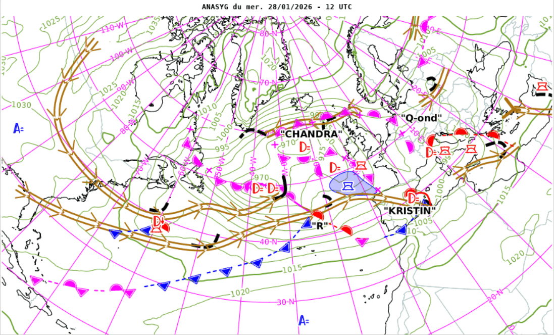 L'ANASYG de 12TU confirme la présence de la dépression Chandra sur l'Atlantique et des creux dépressionnaires sur l'Espagne et les Alpes. C'est l'onde Q qui nous concerne donc en début de manche.