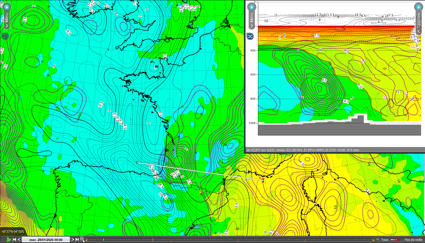 Figure 3 : Altitude (PV 350hPa en contours noirs et VV 600hPa contours violets) + theta'w 850hPa + coupe associée, ARP0.25, run de J-1 à 18TU pour J à 00TU