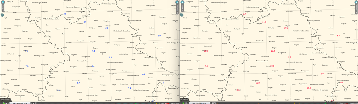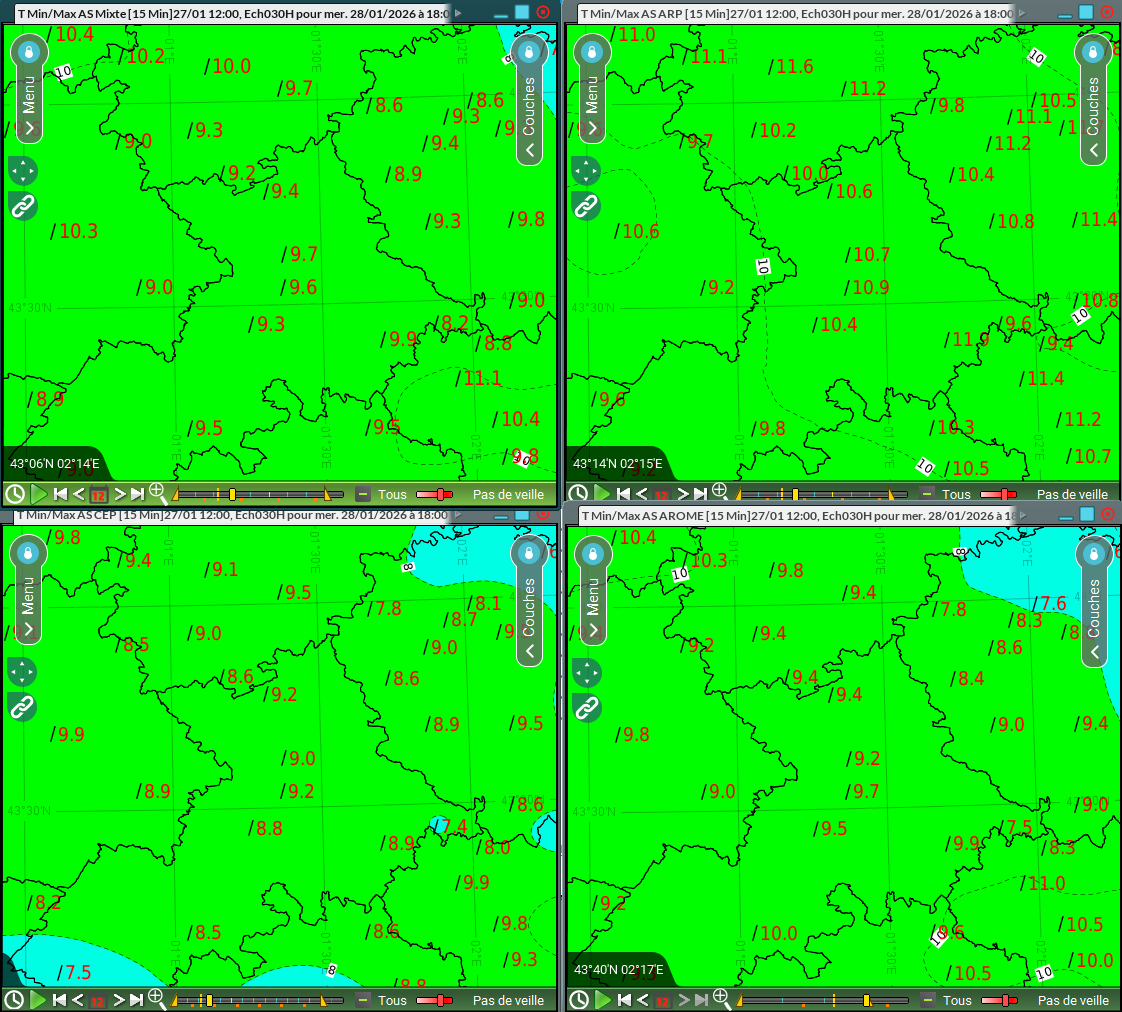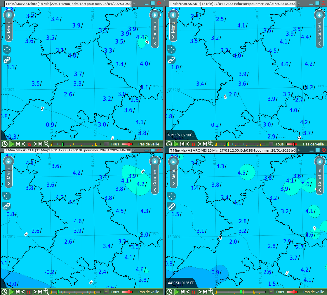 La Tmin est directement influencée par le passage et l'intensité du front froid. CEP, qui prévoit le front le plus atténué, présente donc la Tmin la plus élevée parmi les quatre AS, 4.6°C pour Toulouse-Blagnac. Vient ensuite Arpège avec 3.9°C et Arome avec 2.8°C, en accord avec l'intensité du front. On peut encore une fois retenir un scénario intermédiaire avec Arpège, qui est le plus en accord avec l'AS mixte à 3.7°C.