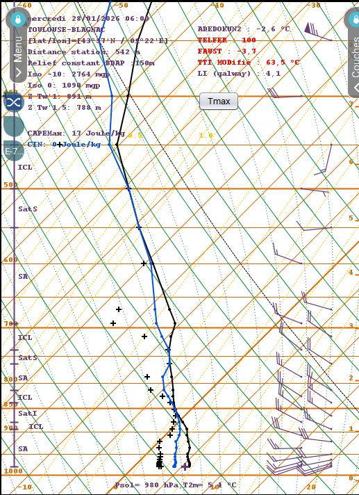 Enfin, le brouillard n'est pas un enjeu pour cette manche et les participants l'ont bien compris, au vu du passage du front froid pendant la nuit. Selon Arome, à 06TU le profil sur Toulouse-Blagnac est encore saturé à plusieurs niveaux, et la masse d'air est relativement sèche au niveau du sol.