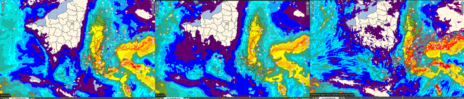 Figure 5 : RR24, ARP0.1 / CEP0.125 / ARO0.025 (de gauche à droite), run de J-1 à 18TU pour J+1 à 00TU