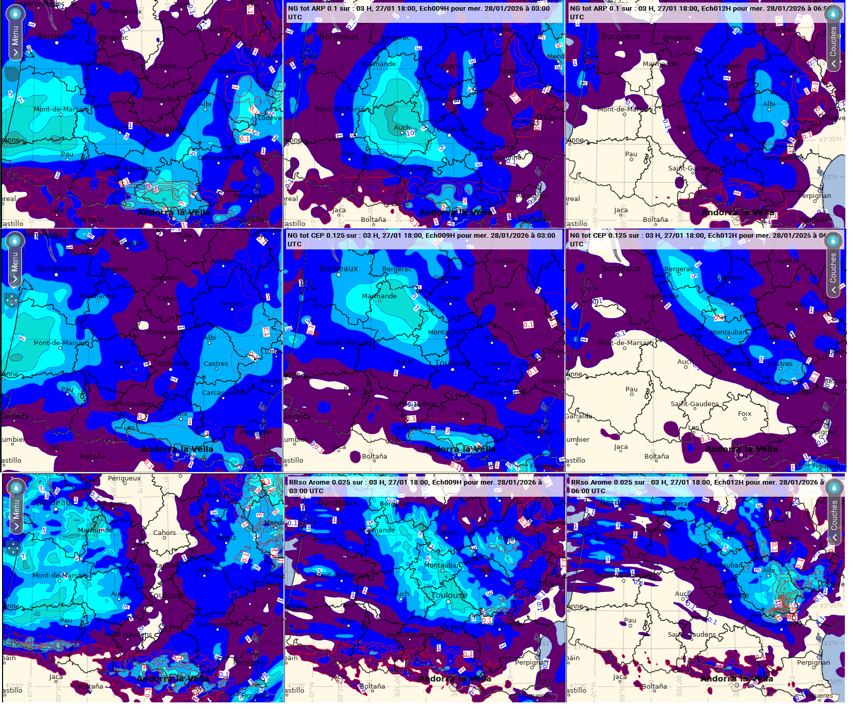 Concernant la chronologie du front froid, les modèles s'accordent pour un maximum de précipitations entre 00 et 03TU (image du milieu), avec un léger retard pour Arpège. Sur les images de gauche, les cumuls sur 3h situés à l'est de Toulouse correspondent au front froid principal qui ne nous concerne pas pour la manche (cumuls entre J-1 21TU et J 00TU).