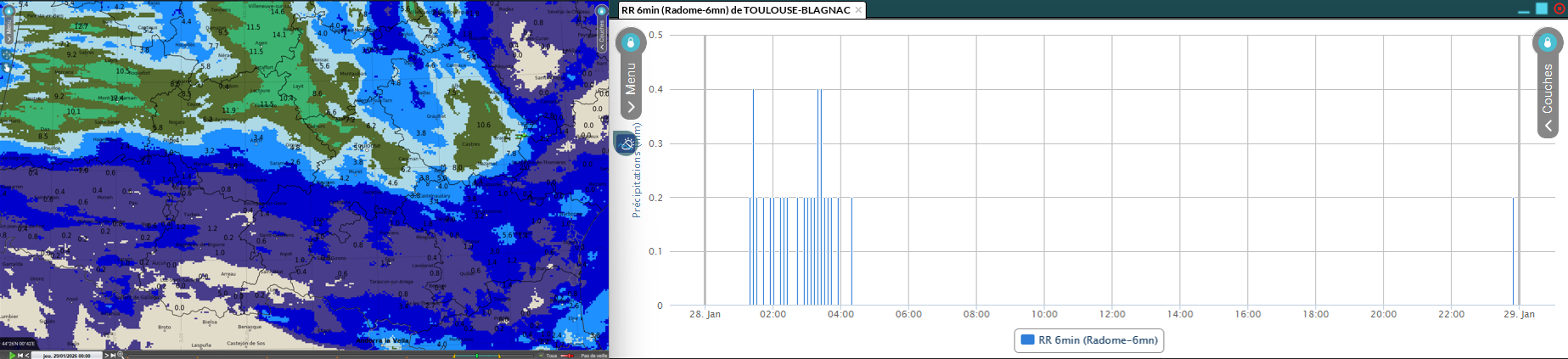 Figure 12 : Lame d'eau Antilope + RR stations sur 24h (gauche) et météogramme RR-Radome 6mn pour Toulouse-Blagnac (droite)