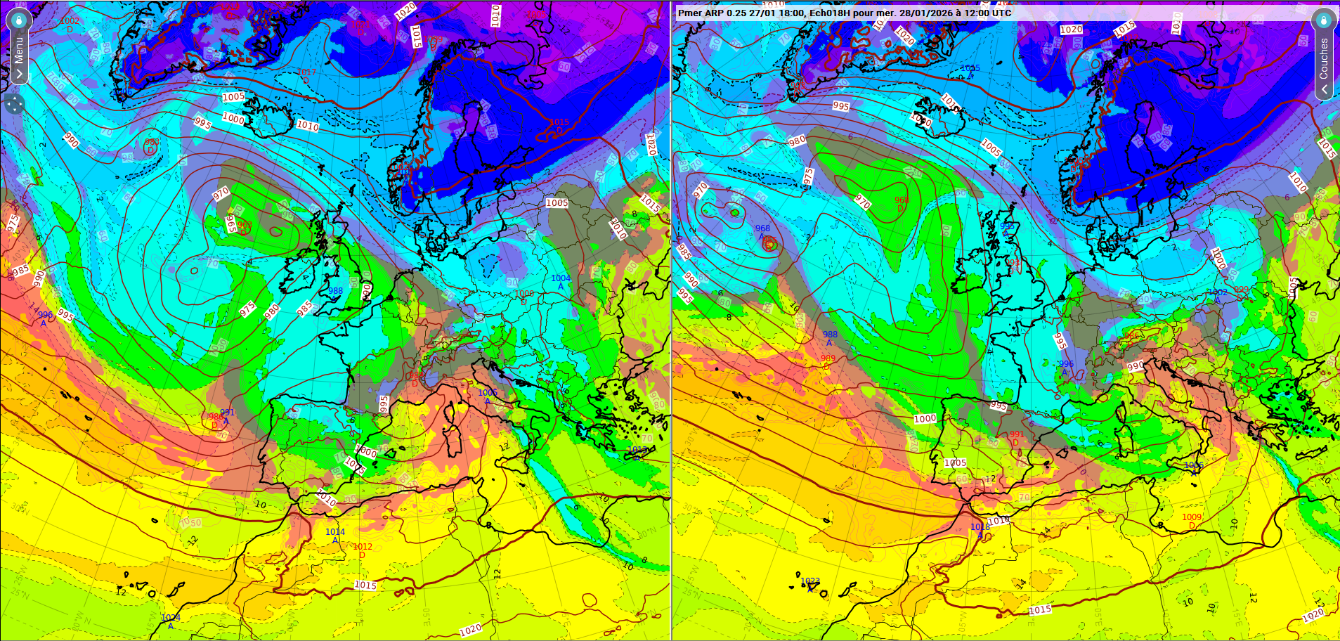 Figure 2 : Surface (Pmer, theta'w 850hPa, HU 700hPa), ARP0.25, run de J-1 à 18TU pour J à 00TU (gauche) puis 12TU (droite)