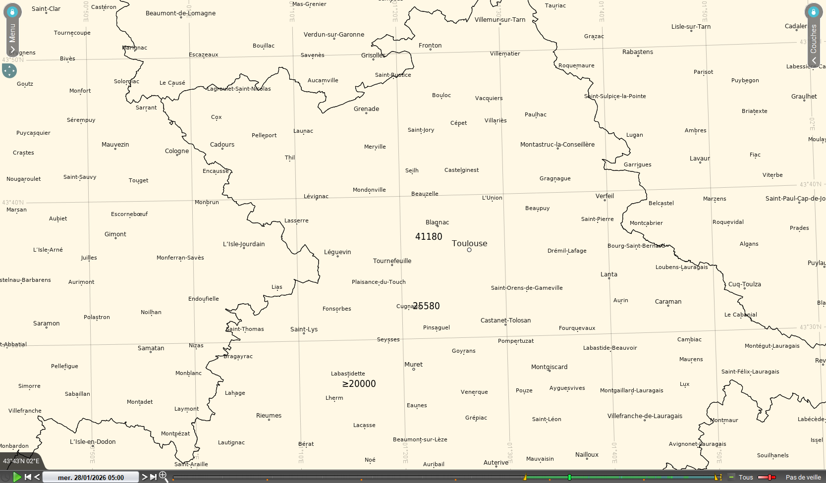 Arpège présentant un scénario intermédiaire entre Arome et CEP au niveau des cumuls, on peut regarder sa prévision d'ensemble pour estimer l'incertitude. Les Q25, Q50 et Q75 prévoient respectivement 3, 5 et 7 mm sur Toulouse-Blagnac, on a donc une assez bonne confiance en des cumuls de cet ordre.