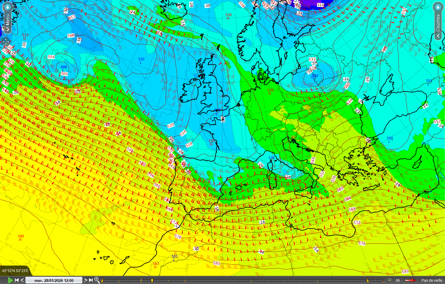 Pour cette quatrième manche, la situation en altitude est pilotée par deux très profonds thalwegs en Z et T qui prolongent un bas géopotentiel à 498 damgp au large de Terre-Neuve. Le premier s'étend sur un axe sud-sud-est jusqu'à l'est de l'Espagne en passant par le golfe de Gascogne, et le second s'étend sur un axe sud-est jusqu'en mer Tyrrhénienne en traversant la France. Ces deux thalwegs repoussent ainsi le jet d'altitude zonal plus au sud en Méditerranée, engendrant un flux assez mou sur la France, excepté sur l'extrême sud, en bordure de jet, qui bénéficie d'un flux d'ouest modéré. La circulation est donc ondulante sur le pays.
