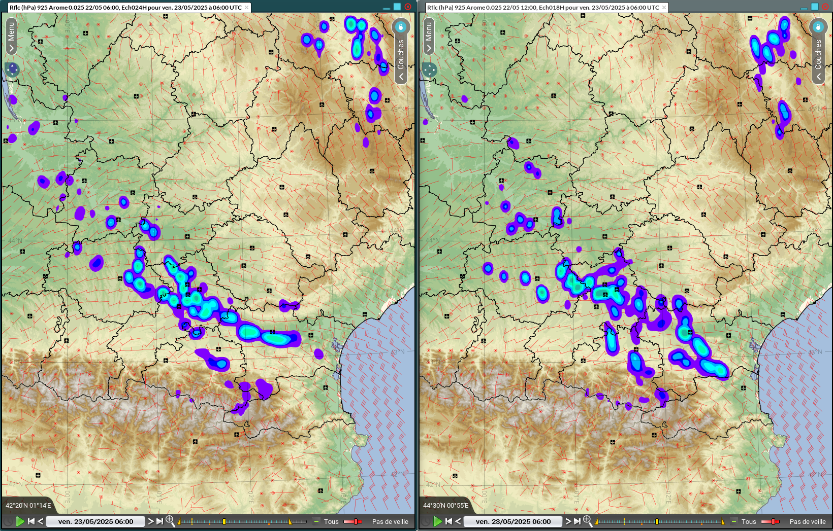Figure 6 : Rflcmax ARO0.01 run 06Z (gauche) et 12Z (droite) du 22/05/25 pour le 23/05/25 06Z