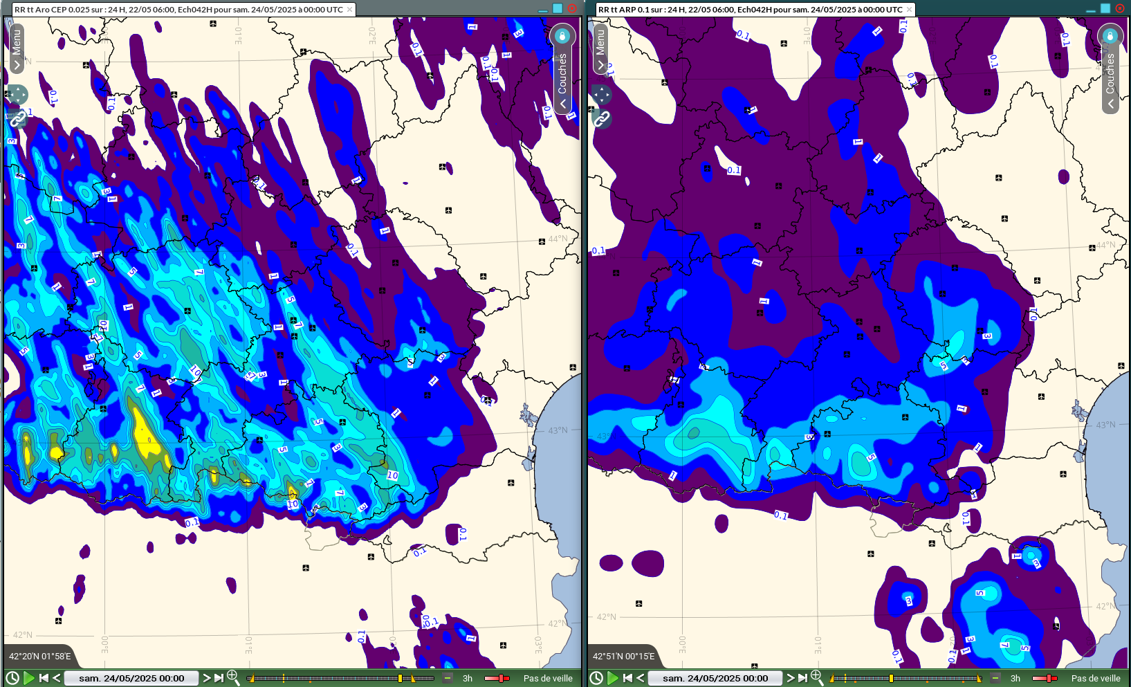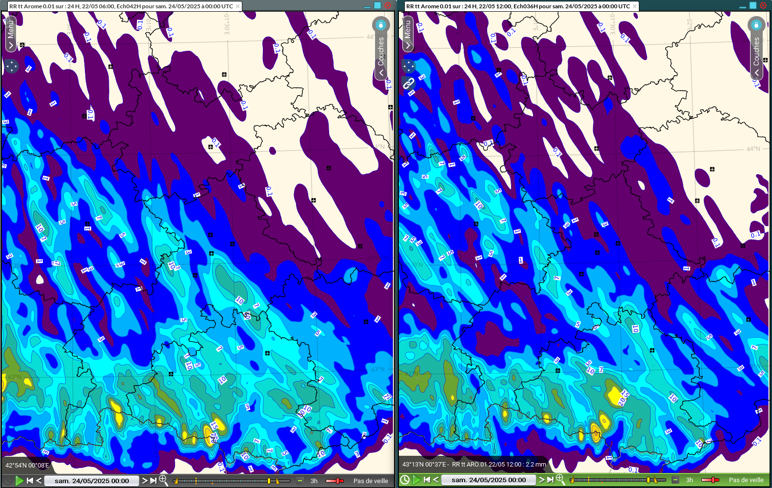 Figure 7 : RR24h ARO0.01 run 06Z (gauche) et 12Z (droite) du 22/05/25 pour le 23/05/25