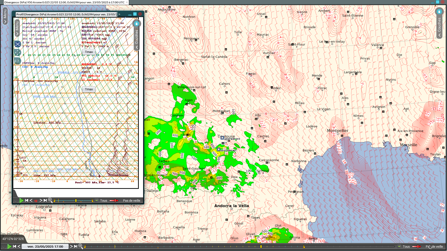 Figure 5 : CAPE (couleur) + vent 10m, AR00.01 12Z du 22/05/2025 pour le 23/05/2025 17Z