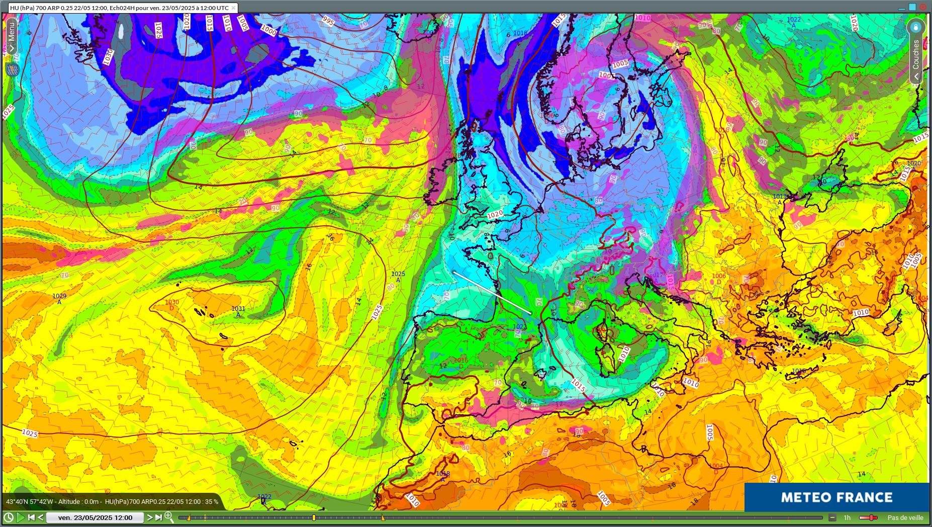 Figure 2 : Pmer + vent10m + tp'w850hPa + Hu700hPa ARP0.25 12Z du 22/05/2025 pour le 23/05/2025 12Z