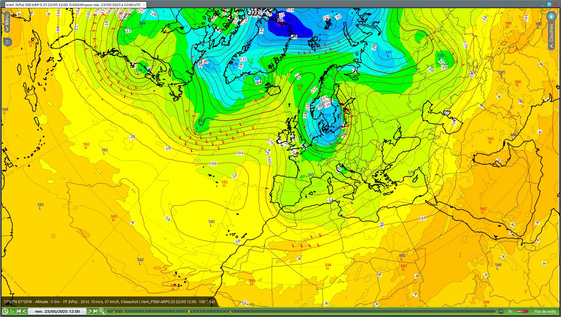 Figure 1 : ZT500 + vent 500hPa ARP0.25 12Z du 22/05/2025 pour le 23/05/2025 12Z