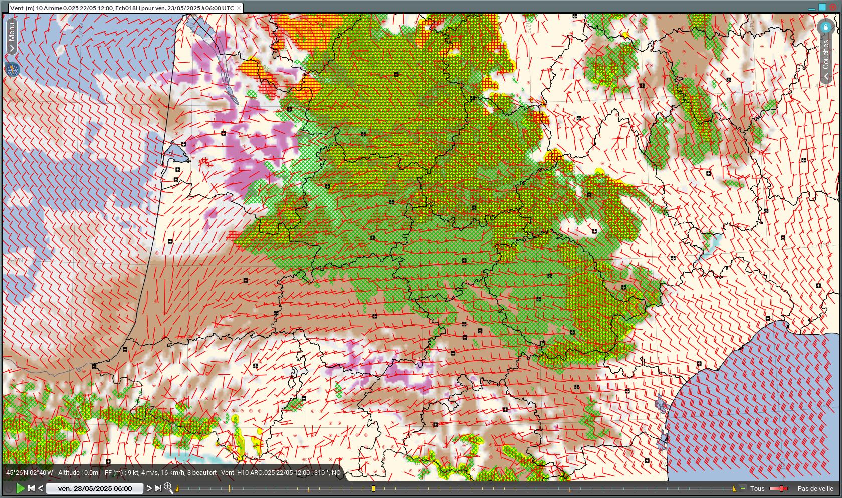Figure 4 : Nébulosité (marron) + vent 10m, AR00.01 12Z du 22/05/2025 pour le 23/05/2025 06Z